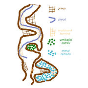 A meander has a depth pattern as well. The cross-overs are marked by riffles, or shallow beds, while at the apices are pools. In a pool direction of flow is downward, scouring the bed material. The major volume, however, flows more slowly on the inside of the bend where, due to decreased velocity, it deposits sediment.