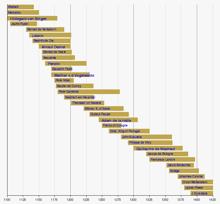 For information about specific composers or poets writing during the early medieval period, see Pope Gregory I, St. Godric, Hildegard of Bingen, Hucbald, Notker Balbulus, Odo of Arezzo, Odo of Cluny, and Tutilo.