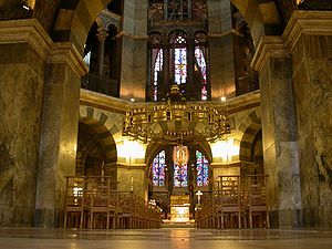 Charlemagne's court in Aachen was the centre of the cultural revival sometimes referred to as the " Carolingian Renaissance". The period saw an increase in literacy, developments in the arts, architecture and jurisprudence, as well as liturgical and scriptural studies. The English monk Alcuin (d. 804) was invited to Aachen and brought the education available in the monasteries of Northumbria. Charlemagne's chancery - or writing office - made use of a new script today known as Carolingian minuscule, allowing a common writing style that advanced communication across much of Europe. Charlemagne sponsored changes in church liturgy, imposing the Roman form of church service on his domains, as well as the Gregorian chant form of liturgical music in the churches. An important activity for scholars during this period was the copying, correcting, and dissemination of basic works on religious and secular topics, with the aim of encourage learning. New works on religious topics and schoolbooks were also produced. Grammarians of the period modified the Latin language, changing it from the Classical Latin of the Roman Empire into a more flexible form to fit the needs of the church and government. By the reign of Charlemagne, the language had become enough different from the classical that it came to be called Medieval Latin.