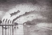 During the War of 1812, Nova Scotia’s contribution to the war effort was communities either purchasing or building various privateer ships to lay siege to American vessels. Three members of the community of Lunenburg, Nova Scotia purchased a privateer schooner and named it Lunenburg on August 8, 1814. The vessel captured seven American vessels. The Liverpool Packet from Liverpool, Nova Scotia, another privateer vessel, is credited with having captured fifty ships during the conflict. Perhaps the most dramatic moment in the war for Nova Scotia was HMS Shannon's leading the captured American frigate USS Chesapeake into Halifax Harbour (1813). Many of the captives were imprisoned and died at Deadman's Island, Halifax.