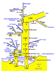The geographical setting of the Mississippi River includes considerations of the course of the river itself, its watershed, its outflow, its prehistoric and historic course changes, and possibilities of future course changes. The New Madrid Seismic Zone along the river is also noteworthy. These various basic geographical aspects of the river in turn underlie its human history and present uses of the waterway and its adjacent lands.