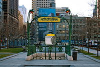 Some of the most important works in the Metro include the stained-glass window at Champ-de-Mars station, the masterpiece of major Quebec artist Marcelle Ferron; and the Guimard entrance at Square Victoria station, like the famous metro entrances designed for the Paris Métro, on permanent loan since 1966 by the RATP to commemorate its cooperation in constructing the metro. Installed in 1967 (the 100th anniversary of Guimard's birth), this is the only authentic Guimard entrance in use outside Paris, although reproductions using original moulds were given to Mexico City ( Metro Bellas Artes on line 8), Chicago ( Van Buren Station on the Metra network), Lisbon ( Picoas station on the yellow line) and Moscow ( Kievskaya station on the Arbatsko-Pokrovskaya).