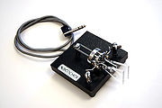 In contrast, Morse and Vail's initial telegraph, which first went into operation in 1844, made indentations on a paper tape when an electrical current was transmitted. Morse's original telegraph receiver used a mechanical clockwork to move a paper tape. When an electrical current was received, an electromagnet engaged an armature that pushed a stylus onto the moving paper tape, making an indentation on the tape. When the current was interrupted, the electromagnet retracted the stylus, and that portion of the moving tape remained unmarked.