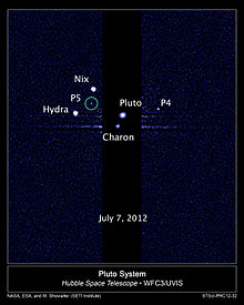 S/2011 (134340) 1 was first seen in a photo taken with Hubble's Wide Field Camera 3 on June 28. It was confirmed in subsequent Hubble pictures taken on July 3 and July 18.