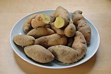 The blue potato (or purple potato) originated in South America. It has purple skin and flesh, which becomes blue once cooked. It has a slight whitish scab that seems to be present in all samples. The variety, called "Cream of the Crop", has been introduced into Ireland and has proved popular.