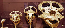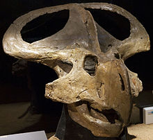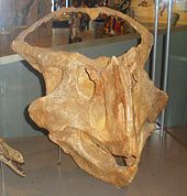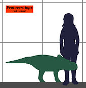 Protoceratops (pron.: / ˌ p r oʊ t oʊ ˈ s ɛr ə t ɒ p s /; from Greek proto-/πρωτο- "first", cerat-/κερατ- "horn" and -ops/-ωψ "face", meaning "First Horned Face") is a genus of sheep-sized (1.5 to 2 m long) herbivorous ceratopsian dinosaur, from the Upper Cretaceous Period ( Campanian stage) of what is now Mongolia. It was a member of the Protoceratopsidae, a group of early horned dinosaurs. Unlike later ceratopsians, however, it was a much smaller creature that lacked well-developed horns and retained some primitive traits not seen in later genera.