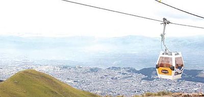 The Aerial tramway Station at Cruz Loma (part of the Pichincha mountain complex at about 4,000 metres (13,000 ft)). Since July 2005, Quito has had an aerial tramway, known as the "Telefériqo", from the city centre to the hill known as Cruz Loma on the east side of the Pichincha volcano. The ride takes visitors to an altitude of about 4,100 metres (13,500 ft). There are also trails for hiking and areas where pictures can be taken of Quito. Because of the increased altitude and the wind on the mountain, it is considerably cooler.