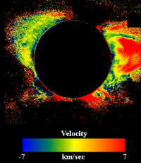 A picture of the solar corona taken with the LASCO C1 coronagraph. The picture is a colour coded image of the doppler shift of the FeXIV 5308 Å line, caused by the coronal plasma velocity towards or away from the satellite.