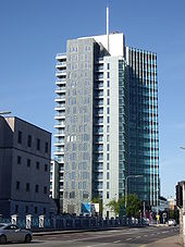 Beginning with the American designed art deco church at Turner's Cross in 1927, Irish architecture followed the international trend towards modern and sleek building styles since the 20th century. Recent developments include the regeneration of Ballymun and an urban extension of Dublin at Adamstown. Since the establishment of the Dublin Docklands Development Authority in 1997, the Dublin Docklands area underwent large-scale redevelopment, which included the construction of the Convention Centre Dublin and Grand Canal Theatre. Completed in 2008, the Elysian tower in Cork is the tallest storeyed building in Ireland, at a height of 71 metres (233 feet), surpassing Cork County Hall. The Royal Institute of the Architects of Ireland regulates the practice of architecture in the state.