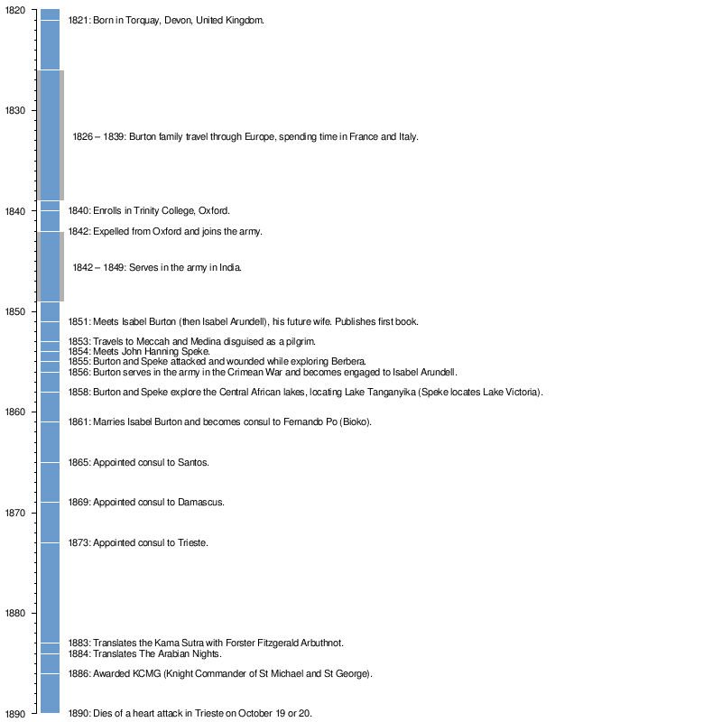 Captain Sir Richard Francis Burton KCMG FRGS ( March 19, 1821 – October 20, 1890) was an English explorer, translator, writer, soldier, orientalist, ethnologist, linguist, poet, hypnotist, fencer and diplomat. He was known for his travels and explorations within Asia and Africa as well as his extraordinary knowledge of languages and cultures. According to one count, he spoke 29 European, Asian, and African languages.