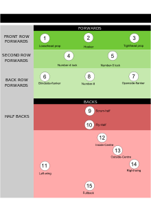 Each team starts the match with 15 players on the field and seven substitutes. Players in a team are divided into eight forwards (two more than in rugby league) and seven backs.