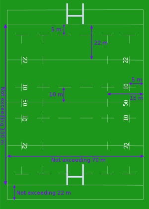 The field of play on a rugby pitch is as near as possible to a maximum of 144 metres (157 yd) long by 70 metres (77 yd) wide. In actual gameplay there should be a maximum of 100 metres (109 yd) between the two try-lines, with anywhere between 10 and 22 metres behind each try line to serve as the in-goal area. There are several lines crossing it, notably the half way line and the "twenty two", which is 22 metres (24 yd) from the goal line.