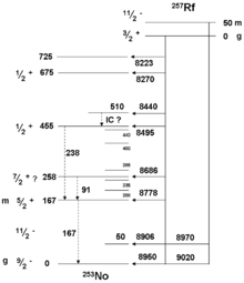 | 257mRf | 4.1 s | ε, α, SF | 1969 | 249Cf(12C,4n) |