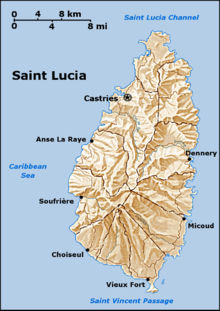 The volcanic island of Saint Lucia is more mountainous than many other Caribbean islands, with the highest point being Mount Gimie, at 950 metres (3,120 ft) above sea level. Two other mountains, the Pitons, form the island's most famous landmark. They are located between Soufrière and Choiseul on the western side of the island. Saint Lucia is also one of the few islands in the world that boasts a drive-in volcano.