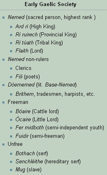 The legal tract known as Laws of the Brets and Scots, probably compiled in the reign of David I, underlines the importance of the kin group as entitled to compensation for the killing of individual members. It also lists five grades of man: King, mormaer, toísech, ócthigern and neyfs. The highest rank below the king, the mormaer ("great officer"), were probably about a dozen provincial rulers, later replaced by the English term earl. Below them the toísech (leader), appear to have managed areas of the royal demesne, or that of a mormaer or abbot, within which they would have held substantial estates, sometimes described as shires and the title was probably equivalent to the later thane. The lowest free rank mentioned by the Laws of the Brets and Scots, the ócthigern (literally, little or young lord), is a term the text does not translate into French. There were probably relatively large numbers of free peasant farmers, called husbandmen or bondmen, in the south and north of the country, but fewer in the lands between the Forth and Sutherland until the twelfth century, when landlords began to encourage the formation of such a class through paying better wages and deliberate immigration. Below the husbandmen a class of free farmers with smaller parcels of land developed, with cottars and grazing tenants (gresemen). The non-free naviti, neyfs or serfs existed in various forms of service, with terms with their origins in Irish practice, including cumelache, cumherba and scoloc who were tied to a lord's estate and unable to leave it without permission, but who records indicate often absconded for better wages or work in other regions or in the developing burghs.