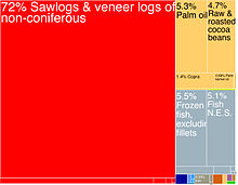 Graphical depiction of the Solomon Islands' product exports in 28 colour-coded categories.