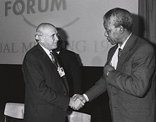 F. W. de Klerk and Nelson Mandela shake hands in January 1992