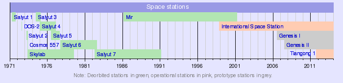 The Soviet space stations came in two types, the civilian Durable Orbital Station (DOS), and the military Almaz stations. (dates refer to periods when stations were inhabited by crews)