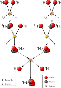 where e+ is a positron, γ is a gamma ray photon, νe is a neutrino, and H and He are isotopes of hydrogen and helium, respectively. The energy released by this reaction is in millions of electron volts, which is actually only a tiny amount of energy. However enormous numbers of these reactions occur constantly, producing all the energy necessary to sustain the star's radiation output.