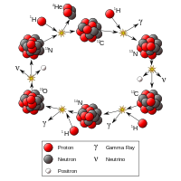 In more massive stars, helium is produced in a cycle of reactions catalyzed by carbon—the carbon-nitrogen-oxygen cycle.