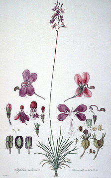 The genus Stylidium (also known as triggerplants or trigger plants) are a group of dicotyledonous plants that belong to the family Stylidiaceae. The genus name Stylidium is derived from the Greek στυλος or stylos (column or pillar), which refers to the distinctive reproductive structure that its flowers possess. Pollination is achieved through the use of the sensitive "trigger", which comprises the male and female reproductive organs fused into a floral column that snaps forward quickly in response to touch, harmlessly covering the insect in pollen. Most of the approximately 300 species are only found in Australia, making it the fifth largest genus in that country. Triggerplants are considered to be protocarnivorous or carnivorous because the glandular trichomes that cover the scape and flower can trap, kill, and digest small insects with protease enzymes produced by the plant.