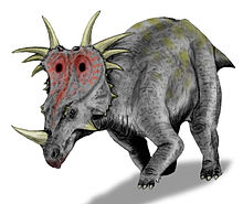 Styracosaurus (pron.: / s t ɨ ˌ r æ k ə ˈ s ɔr ə s / stə-RAK-ə-SOR-əs; meaning "spiked lizard" from the Ancient Greek styrax/στύραξ "spike at the butt-end of a spear-shaft" and sauros/ σαῦρος "lizard") was a genus of herbivorous ceratopsian dinosaur from the Cretaceous Period ( Campanian stage), about 76.5 to 75.0 million years ago. It had four to six long horns extending from its neck frill, a smaller horn on each of its cheeks, and a single horn protruding from its nose, which may have been up to 60 centimetres (2 ft) long and 15 centimetres (6 in) wide. The function or functions of the horns and frills have been debated for many years.