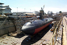 The US Navy Los Angeles-class attack submarine USS Greeneville in dry dock, showing typical cigar-shaped hull.