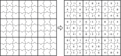 There are many other variants. Some are different shapes in the arrangement of overlapping 9×9 grids, such as butterfly, windmill, or flower. Others vary the logic for solving the grid. One of these is Greater Than Sudoku. In this a 3×3 grid of the Sudoku is given with 12 symbols of Greater Than (>) or Less Than (<) on the common line of the two adjacent numbers. Another variant on the logic of solution is Clueless Sudoku, in which nine 9×9 Sudoku grids are themselves placed in a 3×3 array. The center cell in each 3×3 grid of all nine puzzles is left blank and form a tenth Sudoku puzzle without any cell completed; hence, "clueless".
