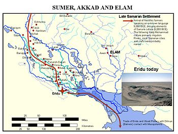 The Ubaid period is marked by a distinctive style of fine quality painted pottery which spread throughout Mesopotamia and the Persian Gulf. During this time, the first settlement in southern Mesopotamia was established at Eridu ( Cuneiform: NUN.KI), ca. 5300 BC, by farmers who brought with them the Hadji Muhammed culture, which first pioneered irrigation agriculture. It appears this culture was derived from the Samarran culture from northern Mesopotamia. It is not known whether or not these were the actual Sumerians who are identified with the later Uruk culture. Eridu remained an important religious centre when it was gradually surpassed in size by the nearby city of Uruk. The story of the passing of the me (gifts of civilisation) to Inanna, goddess of Uruk and of love and war, by Enki, god of wisdom and chief god of Eridu, may reflect this shift in hegemony. It appears that this early culture was an amalgam of three distinct cultural influences: peasant farmers, living in wattle and daub or clay brick houses and practicing irrigation agriculture; hunter-fishermen living in woven reed houses and living on floating islands in the marshes (Proto-Sumerians); and Proto-Akkadian nomadic pastoralists, living in black tents.