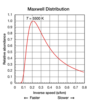 While the Boltzmann constant is useful for finding the mean kinetic energy of a particle, it's important to note that even when a substance is isolated and in thermodynamic equilibrium (all parts are at a uniform temperature and no heat is going into or out of it), the translational motions of individual atoms and molecules occurs across a wide range of speeds (see animation in Figure 1 above). At any one instant, the proportion of particles moving at a given speed within this range is determined by probability as described by the Maxwell–Boltzmann distribution. The graph shown here in Fig. 2 shows the speed distribution of 5500 K helium atoms. They have a most probable speed of 4.780 km/s. However, a certain proportion of atoms at any given instant are moving faster while others are moving relatively slowly; some are momentarily at a virtual standstill (off the x–axis to the right). This graph uses inverse speed for its x–axis so the shape of the curve can easily be compared to the curves in Figure 5 below. In both graphs, zero on the x–axis represents infinite temperature. Additionally, the x and y–axis on both graphs are scaled proportionally.