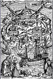 Woodcut by Ambrosius Holbein for a 1518 edition of Utopia. The traveler Raphael Hythloday is depicted in the lower left-hand corner describing to a listener the island of Utopia, whose layout is schematically shown above him.