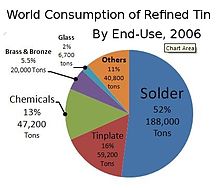 In 2006, about half of tin produced was used in solder. The rest was divided between tin plating, tin chemicals, brass and bronze, and niche uses.