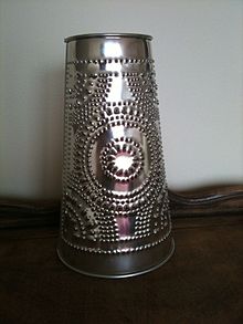 Punched tin, also called pierced tin, is an artisan technique originating in central Europe for creating housewares that are both functional and decorative. Decorative piercing designs exist in a wide variety, based on geography or the artisan's personal creations. Punched tin lanterns are the most common application of this artisan technique. The light of a candle shining through the pierced design creates a decorative light pattern in the room where it sits. Punched tin lanterns and other punched tin articles were created in the New World from the earliest European settlement. A well-known example is the Revere type lantern, named after Paul Revere.