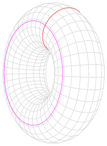 A torus is the product of two circles, in this case the red circle is swept around axis defining the pink circle. R is the radius of the pink circle, r is the radius of the red one.