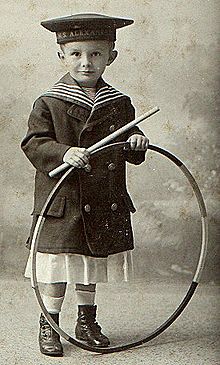 A boy with a hoop. Hoops have long been a popular toy across a variety of cultures.