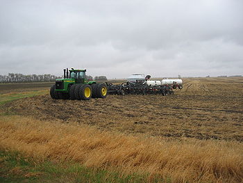 A modern steerable all-tracked power unit planting wheat in North Dakota