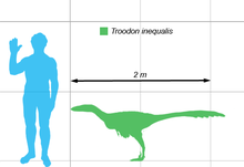 Troodon (pron.: / ˈ t r oʊ . ə d ɒ n / TROH-ə-don; Troödon in older sources) is a genus of relatively small, bird-like dinosaurs from the Late Cretaceous period ( Campanian age, around 75 mya). It includes at least one species, Troodon formosus, though many fossils, possibly representing several species have been classified in this genus. These species ranged widely, with fossil remains recovered from as far north as Alaska and as far south as Wyoming and even possibly Texas and New Mexico. Discovered in 1855, T. formosus was among the first dinosaurs found in North America.