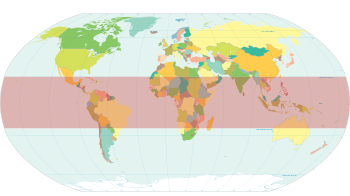 This area is centered on the equator and limited in latitude by the Tropic of Cancer in the northern hemisphere, at approximately 23°26' (23.4°) N latitude, and the Tropic of Capricorn in the southern hemisphere at 23°26' (23.4°) S latitude. This region is also referred to as the tropical zone and the torrid zone (see geographical zone).