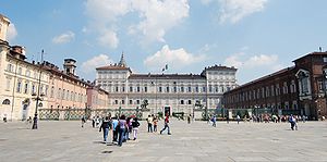 | A collage of Turin: in the top left is the Mole Antonelliana, followed by a view of the city under the snow, the Piazza Vittorio Veneto, the Royal Palace of Turin and the Museo del Risorgimento (Palazzo Carignano) | |||