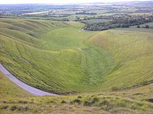 The Uffington White Horse is a highly stylized prehistoric hill figure, 110 m long (374 feet), formed from deep trenches filled with crushed white chalk. The figure is situated on the upper slopes of White Horse Hill in the English civil parish of Uffington (in the county of Oxfordshire, historically Berkshire), some 8 km (5 mi) south of the town of Faringdon and a similar distance west of the town of Wantage. The hill forms a part of the scarp of the Berkshire Downs and overlooks the Vale of White Horse to the north. Best views of the figure are obtained from the air, or from directly across the Vale, particularly around the villages of Great Coxwell, Longcot and Fernham. The site is owned and managed by the National Trust.