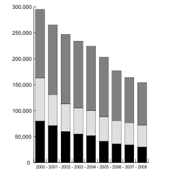 Black represents employment numbers in Europe, light grey represents the Americas and dark grey represents Asia, Africa, and Middle East. Between 2000 and 2008 Unilever reduced global workforce numbers by 41%, from 295,000 to 174,000. Note: Europe figures for 2000-2003 are all Europe; from 2004 figures in black are Western Europe. For 2004-2008 Figures for Asia, Africa and Middle East include Eastern and Central Europe.