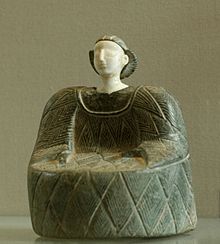 Female statuette wearing the kaunakes. Chlorite and limestone, Bactria, beginning of the 2nd millennium BC.