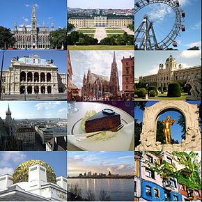 Left–right, top–bottom: Rathaus, Schloss Schönbrunn, Riesenrad, Staatsoper, Stephansdom, Kunsthistorisches Museum, Stephansplatz, Sachertorte, Johann-Strauß-Denkmal, Sezession, Donau City, Hundertwasserhaus