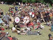 The last major battle involving Vikings was the Battle of Clontarf in 1014, in which a large force from the pan-Viking world and their Irish allies opposed Brian Boru, then the High King of Ireland and his forces, a small contingent of which were Viking defectors. The battle was fought in what is the now Dublin suburb of Clontarf on Good Friday of that year. Boru, the Irish High King had gracefully allowed the Viking King of Dublin; Sigtrygg Silkbeard, one year to prepare for his coming assault. Silkbeard responded by offering the bed of his mother to several Viking lords from Scandinavia and the British Isles. The savage melee between the heavily mailed Norse and the unarmoured, yet undaunted Gaels ended in a rout of the Vikings and their Irish allies. Careful accounts were taken by both sides during the battle, and thus many famous warriors sought each other out for personal combat and glory. High King Brian, who was nearly eighty, did not personally engage in the battle but retired to his tent where he spent the day in quiet prayer. The Viking Earl Brodir of Man chanced upon Brian's tent as he fled the field. He and a few followers seized the opportunity, and surprised the High King, killing the aged Brian before being captured. Brian's foster son Wolf the Quarrelsome later tracked down and dispatched Brodir by disembowelment; Wolf watching as Brodir marched and wound his own innards around the trunk of a large tree. The battle was fairly matched for most of the day and each side had great respect for the prowess of the other; however, in the end, the Irish forced the Norse to return to the sea. Many of the fleeing Vikings were drowned in the surf due to their heavy mail coats as they struggled for the safety of their longships; others were pursued and slain further inland. After the battle, Viking power was broken in Ireland forever, though many settled Norse remained in the cities and prospered greatly with the Irish through trade. With Brian dead, Ireland returned to the fractured kingdom it had once been, but was now cleared of further Viking predation.
