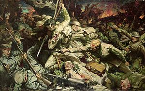 Historian Kenneth Morgan described Wales on the eve of the First World War as a "relatively placid, self-confident, and successful nation". Output from the coalfields continued to increase, with the Rhondda Valley recording a peak of 9.6 million tons of coal extracted in 1913. The outbreak of the First World War (1914–1918) saw Wales, as part of the United Kingdom, enter hostilities with Germany. A total of 272,924 Welshmen served in the war, representing 21.5% of the male population. Of these, roughly 35,000 were killed. The two most notable battles of the War to include Welsh forces were those at Mametz Wood on the Somme and Third Ypres.