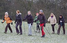 Fitness walkers and others may use a pedometer to count their steps. The types of walking include bushwalking, racewalking, weight-walking, hillwalking, volksmarching, Nordic walking and hiking on long-distance paths. Sometimes people prefer to walk indoors using a treadmill. In some countries walking as a hobby is known as hiking (the typical North American term), rambling (a somewhat dated British expression, but remaining in use because it is enshrined in the title of the important Ramblers), or tramping. Hiking is a subtype of walking, generally used to mean walking in nature areas on specially designated routes or trails, as opposed to in urban environments; however, hiking can also refer to any long-distance walk. More obscure terms for walking include "to go by Marrow-bone stage", "to take one's daily constitutional", "to ride Shanks' pony", "to ride Shanks' mare", or "to go by Walker's bus". Among search and rescue responders, those responders who walk (rather than ride, drive, fly, climb, or sit in a communications trailer) often are known as "ground pounders".