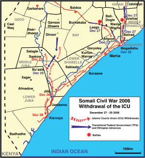 By 26 December, the Islamic Courts Union retreated towards Mogadishu, before again retreating as TFG/Ethiopian troops neared, leaving them to take Mogadishu with no resistance. The ICU then fled to Kismayo, where they fought Ethiopian/TFG forces in the Battle of Jilib.