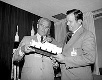 ![]() Von Braun at his desk at Marshall Space Flight Centre in May 1964, with models of the Saturn rocket family  |