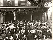 William and Ida McKinley (to her husband's right) pose with members of the "Flower Delegation" from Oil City, Pennsylvania, before the McKinley home. Although women could not vote in most states, they might influence male relatives and were encouraged to visit Canton.