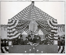McKinley, (right of centre) flanked by Georgia Governor Allen D. Candler (front row to McKinley's left) and Gen. William Rufus Shafter, reviewing the Atlanta Peace Jubilee parade, December 15, 1898. No African Americans are visible in the photograph.